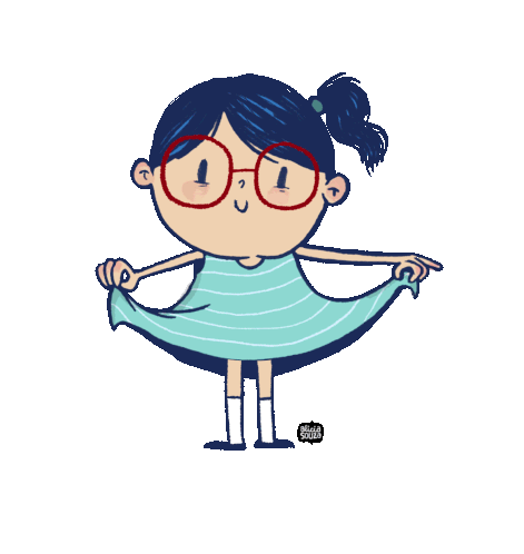 Alicia Souza's cute little girl character dances and bows, holding her striped dress, with a sweet smile.
