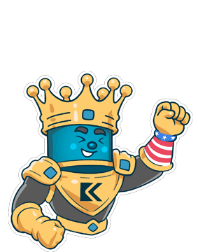 The Masfico Kingsmen character, a blue figure with a crown and 'K' emblem, celebrates Happy New Year 2025 with confetti.