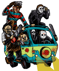 Freddy Krueger, Chucky, Ghostface, Jason Voorhees, and Michael Myers take a spooky ride in the iconic Mystery Machine.