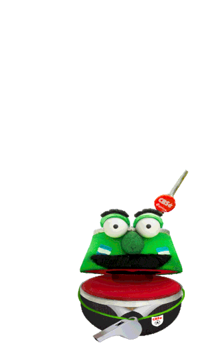 Animated sticker of a green muppet-like character, a football referee, celebrating with a mate. Features Messi and Copa America.