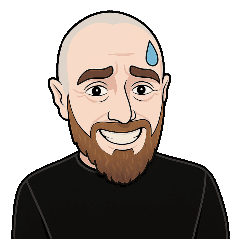 a cartoon drawing of a man with a beard and a sweaty forehead