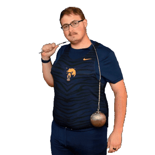 a man wearing a blue nike shirt holds a hammer