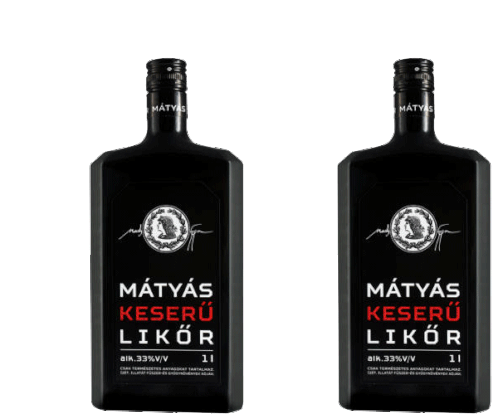 Two black bottles of Matyas Keseru Likor clink together in a toast, showcasing the Hungarian bitter liqueur.
