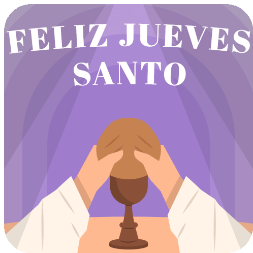 A sticker celebrating Feliz Jueves Santo (Maundy Thursday) with hands breaking bread over a chalice.