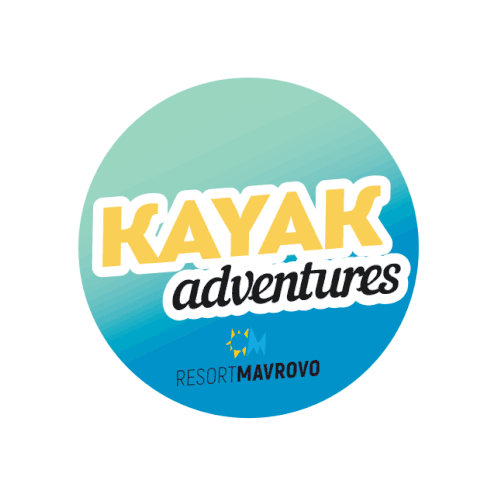Animated logo for Kayak Adventures at Resort Mavrovo, featuring a kayak paddling across the vibrant circular design.