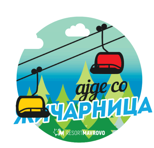 An animated sticker featuring two colorful cable cars moving across a mountain landscape with 'RESORT MAVROVO' and 'Let's go with the cable car' text.