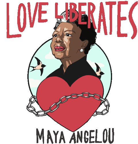 a poster of maya angelou with a heart chained to her