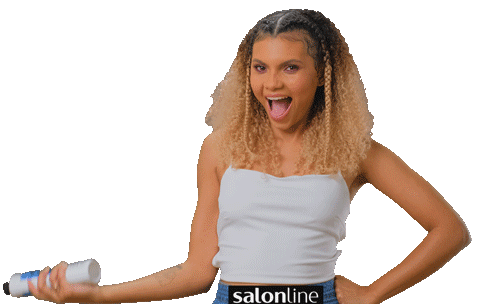 Mayarah Batista excitedly shows off a Salon Line hair product, celebrating healthy hair growth and strength with a big smile.