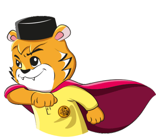 Maybank's Harimau Malaya mascot, a superhero tiger in a songkok, celebrates Raya with a confident 'Terer!' pose.