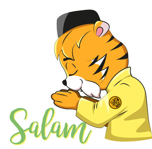 A friendly Maybank Harimau Malaya tiger, in traditional attire, offers a 'Salam' greeting for Raya celebrations.