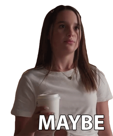 Annie Leblanc holds a coffee cup with 'MAYBE' written on it, expressing uncertainty or consideration.