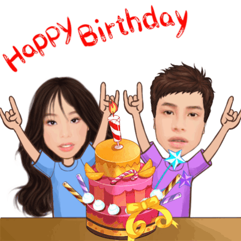 Maymay and Donny celebrate a happy birthday with a festive cake, making rock-on gestures. Perfect for birthday wishes.