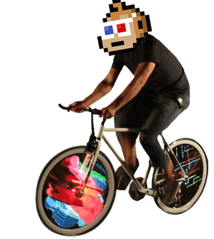 A man with a pixelated Mbb Monkey head and 3D glasses rides a bike with colorful, spinning wheels.