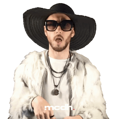 A stylish man in a fur coat and wide-brimmed hat reacts with a surprised, open-mouthed expression, featuring the Mcdh logo.