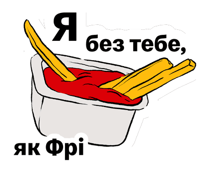 A playful sticker showing french fries and ketchup with Ukrainian text 'I without you, like Fries without sauce', expressing affection.