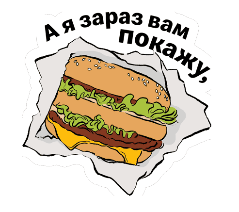 Animated sticker from McDonald's Ukraine showing how to bite a Big Mac, with Ukrainian text 'А я зараз вам покажу, як Біг Мак кусати'.