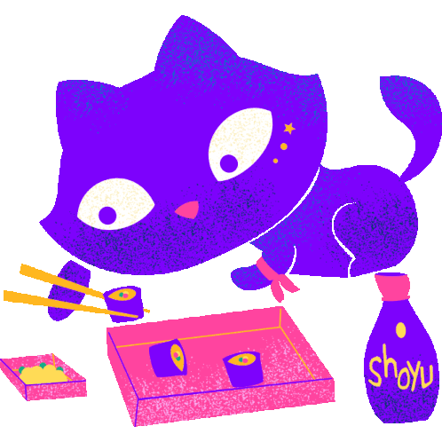 A charming purple cat from Mcdstudio enjoys sushi with chopsticks, accompanied by a bottle of shoyu.