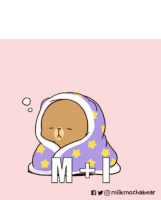 Two adorable cartoon bears, brown and white, cuddle under a starry purple blanket, expressing 'M + I Love You <3'.