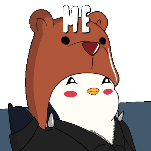 A cute cartoon Pudgy Penguin wearing a bear hat with "ME" on it, pointing with a confident expression.