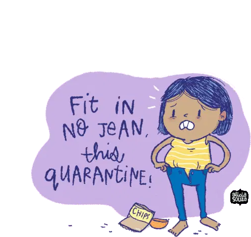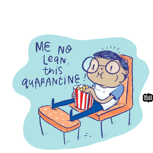 Alicia Souza's humorous sticker of a person relaxing with popcorn, declaring 'Me no lean, this quarantine!'