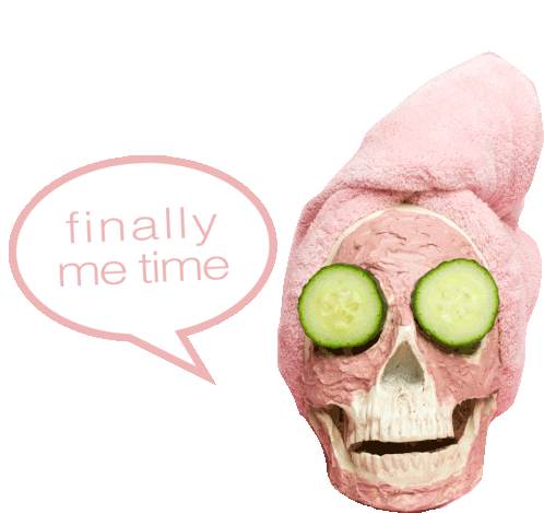 An animated skull with cucumber slices over its eyes enjoys some 'finally me time', relaxing and pampering itself.