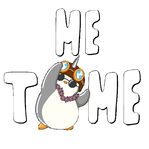 A cute cartoon penguin wearing sunglasses and an aviator helmet with a lei, posing with the text 'ME TO ME' for a self-care break.