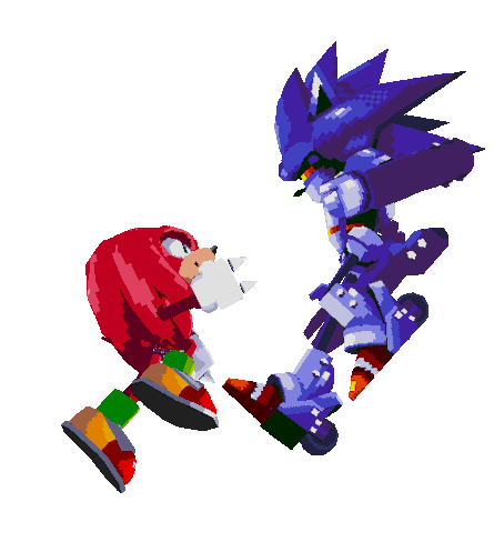 An animated pixel art sticker featuring Mecha Sonic and Knuckles the Echidna in an intense battle sequence.