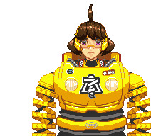 A pixel art anime girl in a yellow mechanica suit with spring-like arms, goggles, and headphones. A unique robot character.