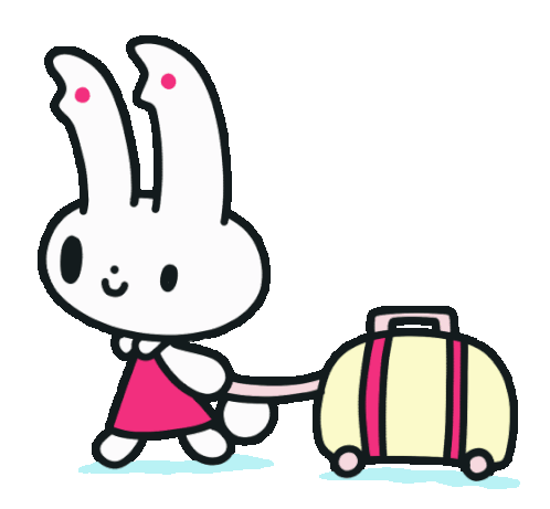 A cute cartoon bunny, Mediusachan, pulls a yellow suitcase, ready for travel with a happy smile.