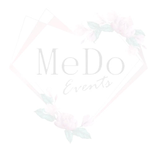 Animated logo for MeDo Events, featuring a delicate heart-shaped frame adorned with pink watercolor flowers and green leaves.