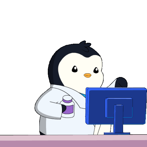 A Pudgy Penguin doctor in a lab coat holds a bottle of pills while working at a computer.