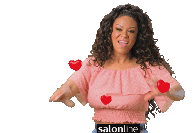 Simone Brown, representing Salonline, joyfully forms a heart shape with her hands, surrounded by floating red hearts.