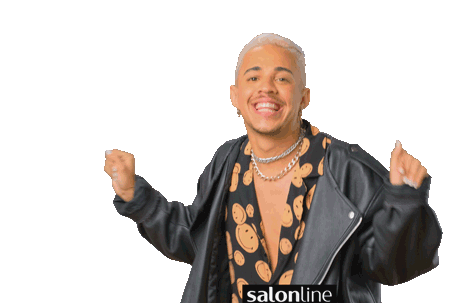 Thiago, also known as Megrava, dancing excitedly in a black leather jacket and smiley face shirt, celebrating with Salonline.