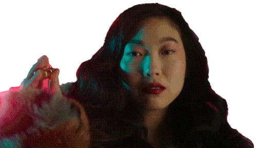 Awkwafina gives a sassy, unimpressed look with dramatic lighting, embodying a 'meh' attitude.