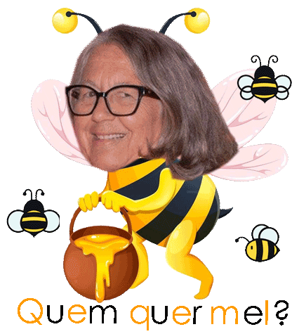 An elderly woman's face is humorously superimposed on a bee, holding a pot of honey and asking 'Who wants honey?'