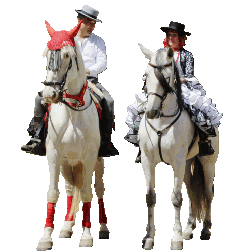 a man and a woman are riding white horses with red socks