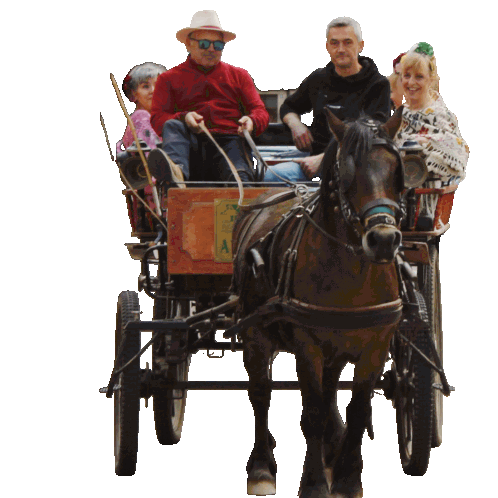a group of people are riding in a horse drawn carriage with the letter a on the side