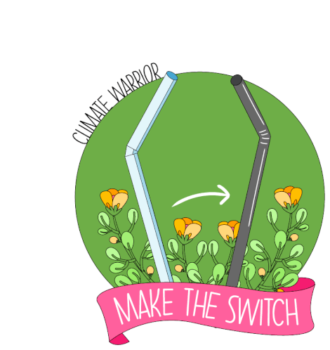 An animated sticker encouraging a switch from plastic to reusable straws, promoting environmental action as a 'Climate Warrior'.