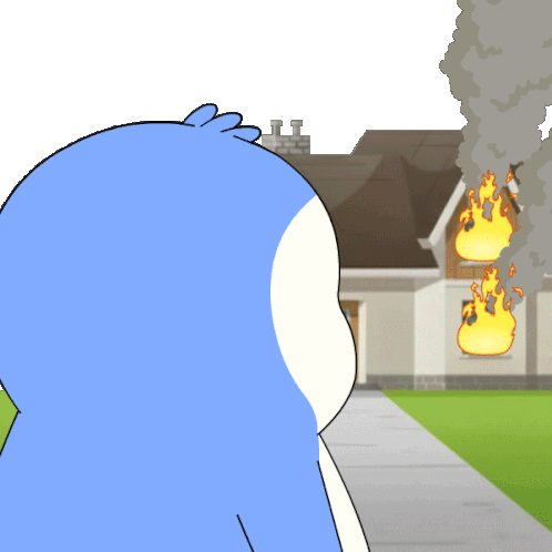 a blue and white cartoon character looking at a house on fire