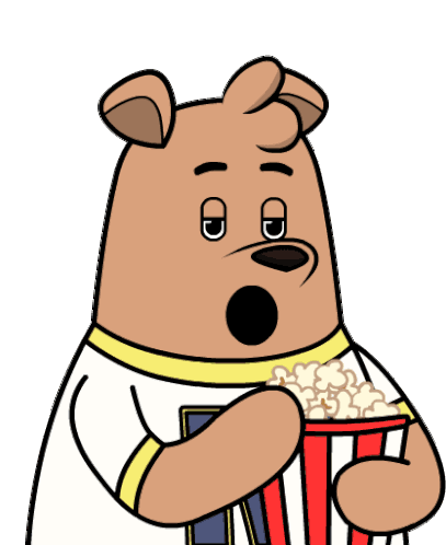 Max Bear, looking bored and sad, sits holding a large bucket of popcorn, engaging in comfort eating.