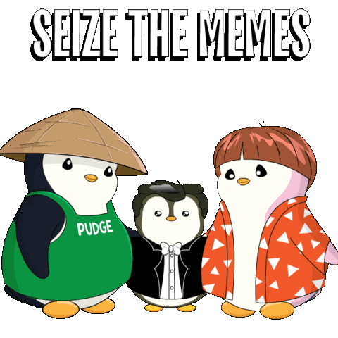 Cute Pudgy Penguins with 'Seize The Memes' text, featuring a chef, a gentleman, and an anime-style penguin.