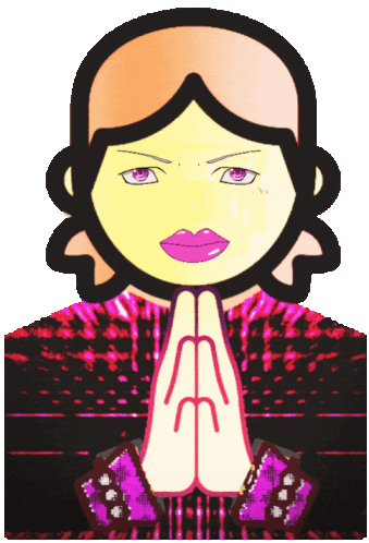 Cartoon woman with hands in prayer gesture, expressing thanks. A meme sticker.