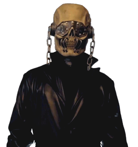 A menacing animated sticker featuring Vic Rattlehead, Megadeth's mascot, wearing a skull mask with chains and a black coat.