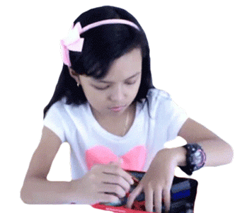 Keira Charma, a little girl with a pink headband, looks into a box with a puzzled expression, searching for something.