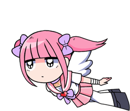 Cute Menhera Chan, also known as Momoka Sakurai, in a pink outfit with pigtails and small wings, floating.