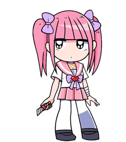 Menhera Chan, also known as Momoka Sakurai, in her signature pink outfit, holding a cutter knife with a determined expression.