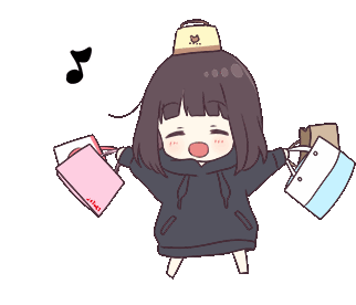 A cute anime-style character, possibly Menhera-chan, happily shopping with bags and a purse on her head, looking excited.