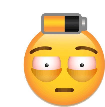 A tired yellow emoji with red eyes and dark circles, showing a critically low battery, symbolizing exhaustion and mental health struggles.