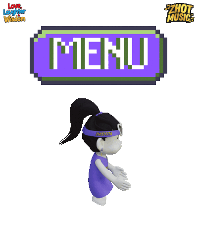 a cartoon girl stands in front of a menu sign
