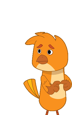 Merimnaw, the orange cartoon bird, gestures with its wings and speaks with a worried or concerned expression.